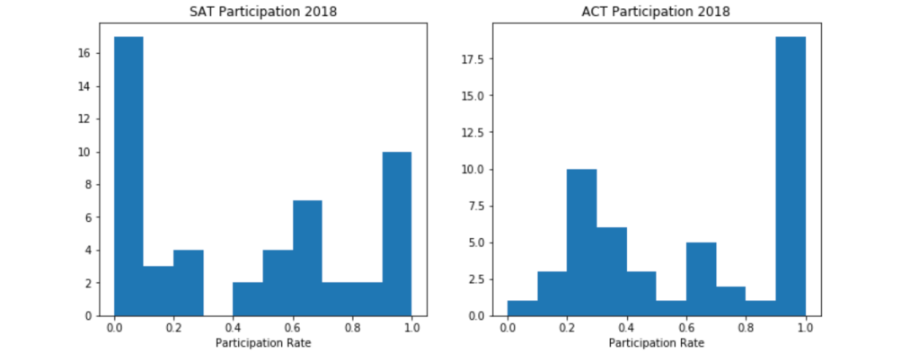 Above scatterplots clearly demonstrate the relationship between participation rate and test scoring. For both tests, lower rates of participation correspond with higher mean score by state. In the SAT plot, for instance, you can see the cluster of ACT-dominated states at top left where SAT participation is very low and mean scores are all >1200. The small subset of high achieving students that bother to take both tests are high scorers, and so these states have artificially higher score averages. The downward slope of both graphs indicates the negative association between the variables.